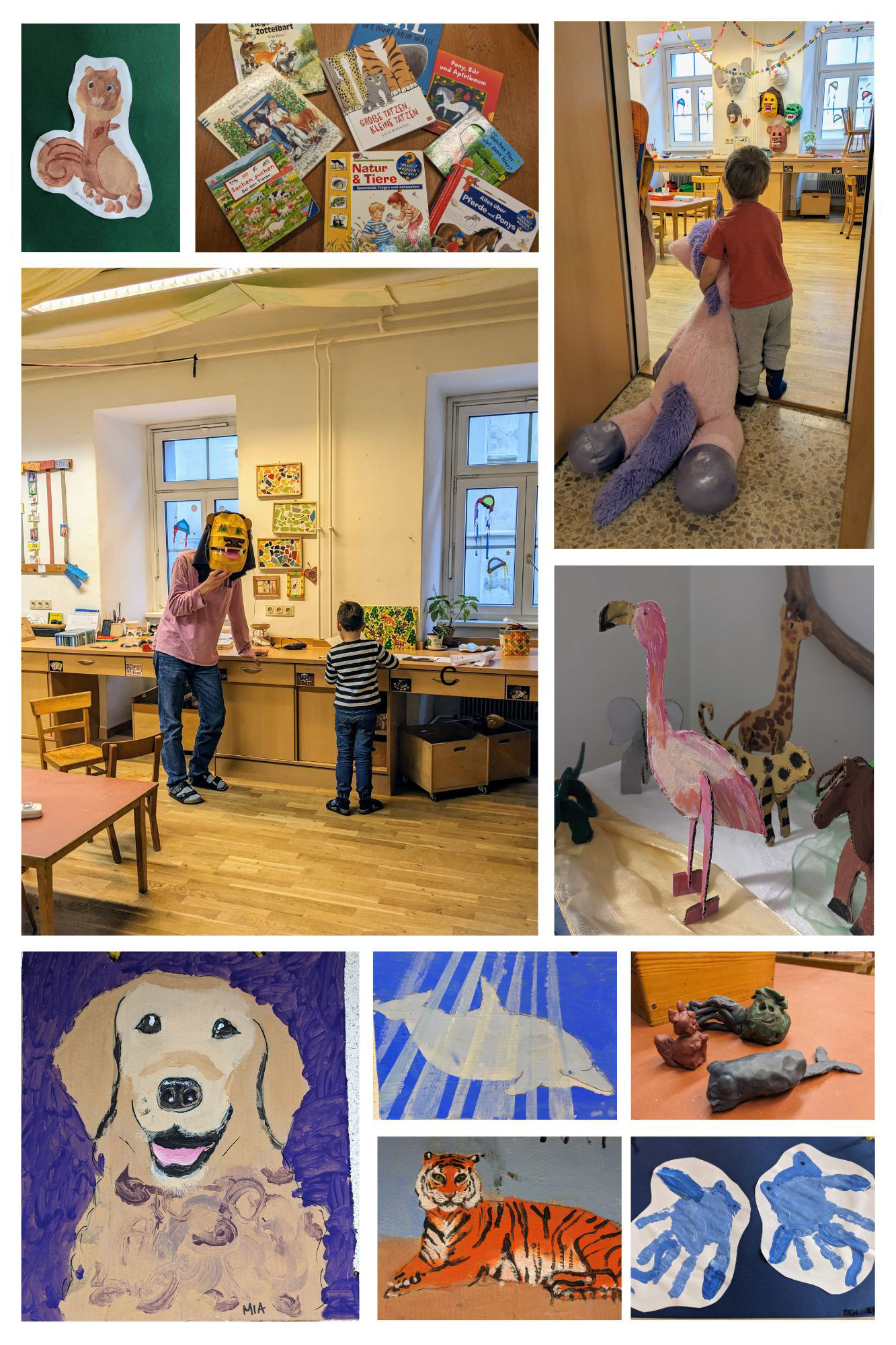 Wir lesen Bücher über Tiere und modellieren sie mit Knetmasse. Unsere Vorschulkinder entwerfen richtige Kunstwerke, achten dabei bereits auf Details und Perspektiven, während die Kleineren Hände und Füße nutzen um verschiedene Tiere zum Leben zu erwecken. Der Werkstoff des Monats ist Karton, denn damit kann man noch viel mehr als nur Pakete verschicken – die Tiermasken, die wir entwerfen, laden zu Rollenspielen ein und begleiten uns bis zum Faschingsfest!