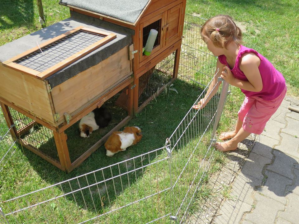 Unsere Meerschweinchen Roxy und Peggy wohnen im Garten. Weil wir viel Obst und Gemüse essen, bekommen sie reichlich Restln. Und ansonsten mähen sie uns den Rasen.