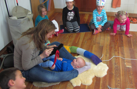 Seit ein paar Wochen bekommt die KIKO alle vierzehn Tage Besuch von Monika und Julian, einer ehemaligen KIKO-Mutter mit ihrem im August geborenen Baby. Die Kinder dürfen dabei sein, wie ein Baby versorgt wird und aufwächst.